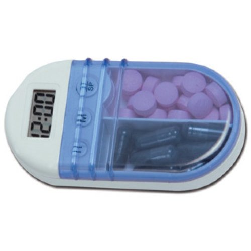 Portapillole tascabie in ABS con timer, fornito con batterie, in singola scatola di cartone. Doppio spazio portapillole per dividere le pillole dalle compresse. Avvisa quando prendere il farmaco con un conto alla rovescia di 19 ore e 59 minuti.
